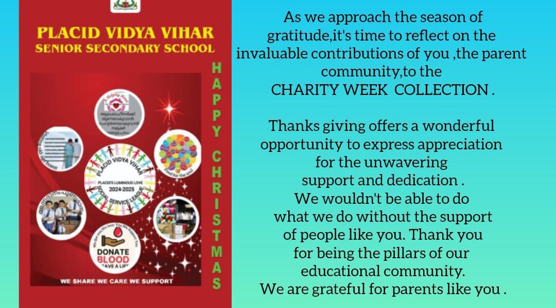 At Placid Vidya Vihar Senior Secondary School, the spirit of giving thrives during our Charity Week Collection. This heartfelt initiative, supported by our dedicated parent community, highlights the power of unity and compassion. As we embrace the season of gratitude, we express our sincere thanks to all the parents whose unwavering support has been the cornerstone of this noble cause. Together, we make a difference, spreading joy and kindness within and beyond our educational community. Thank you for being an integral part of this journey of giving!